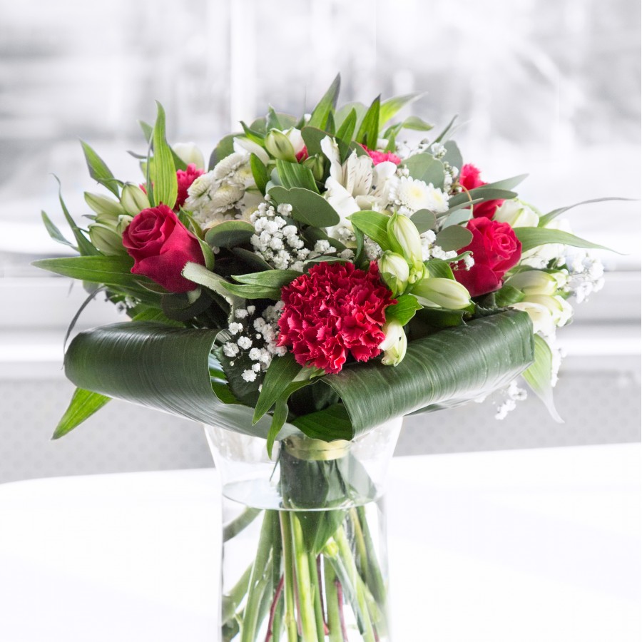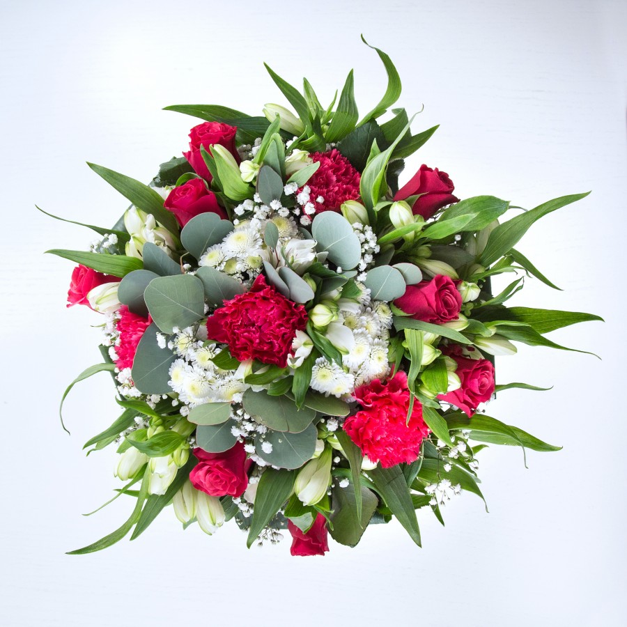 Elevate your gifting experience with our unique bouquet, a true celebration of color and design. This arrangement features white chrysanthemums, delicate gypsophila, and sumptuous red roses, intertwined with cheerful carnations.