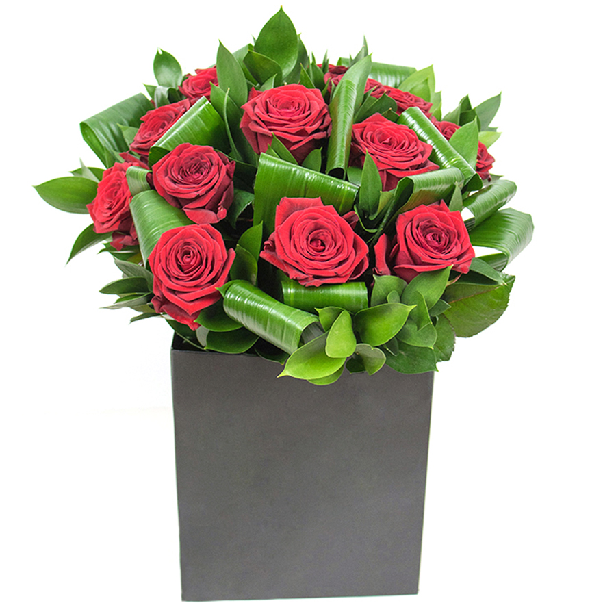 Embrace the elegant charm of our red rose and greenery arrangement, featuring a stunning mix of vibrant red roses, lush aspidistra leaves, and delicate ruscus. This unique bouquet is designed to bring sophistication and beauty to any space.