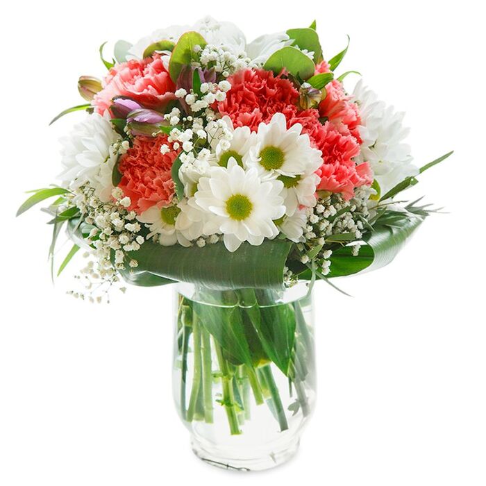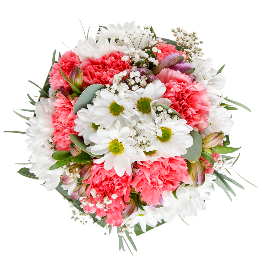 Show your love with our timeless bouquet, featuring pristine white chrysanthemums, delicate gypsophila, and soft pink carnations, gracefully arranged with vibrant aspidistra leaves.